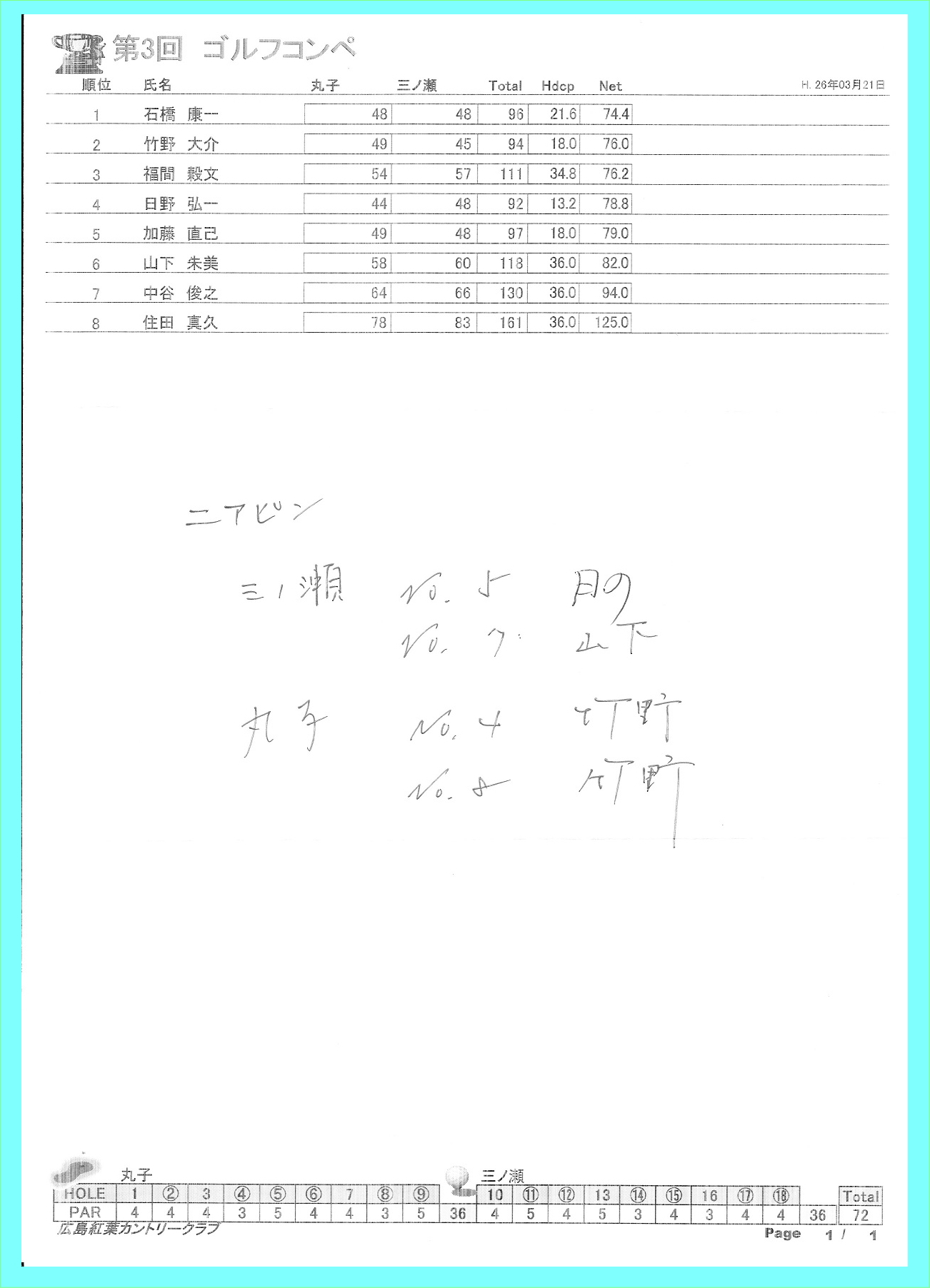 春分の日とは思えない、雨、雹、雪、最悪の天候の中、住田君(1組)、中谷君(3組)が初参加し、 8名で第3回ゴルフコンペを開催いたしました。 スコアにこだわらず、一日楽しくプレーしました。 次会もホームページでご案内しますので、是非ともご参加ください。